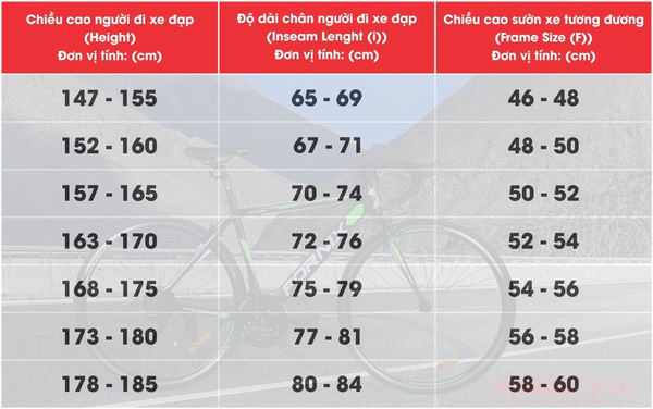 | Chiều cao của người lái (centimet) | Inseam x 0,685 (centimet) | Kích thước khung (centimet) | Kích cỡ |